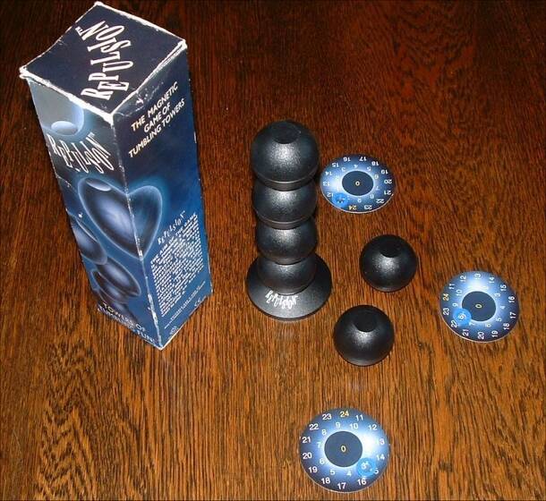 "Repulsion" is a dexterity game in which, like Jenga, the object is to take turns building a tower and to try not to be the person who causes the tower to topple. In this game, though, the tower-building elements are six plastic spheres, with each sphere flattened at each of two ends. Inside the spheres at each end are magnets, so the magnetic fields...