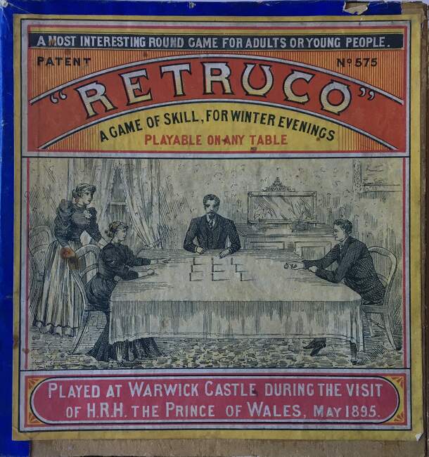 Retruco is described on the box as "A Game of Skill, for Winter Evenings, Playable on any Table". It also is an early example of celebrity marketing, as the box declares "Played at Warwick Castle During the Visit of H.R.H. The Prince of Wales, May 1895". The box claims "Patent No. 575". The rules say the name is Spanish for "a recoiling" and the game...