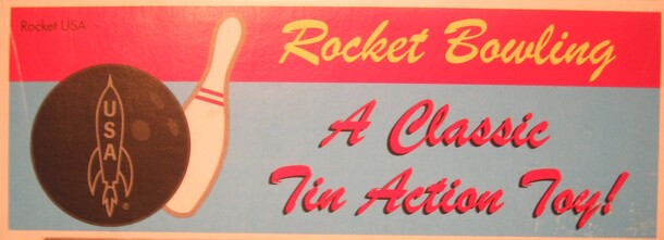 Rocket Bowling is a vintage tin action toy. For one or more players. Play time is approx. 15-20 Mins. or more depending on how many players you have. Set includes: one tin bowling lane (29.75"L X 6.25"W), 10 real wooden pins, two black marbles, and, one tin bowler figure. You start the game by setting up the bowler on the end of the lane. His arm is pulled...