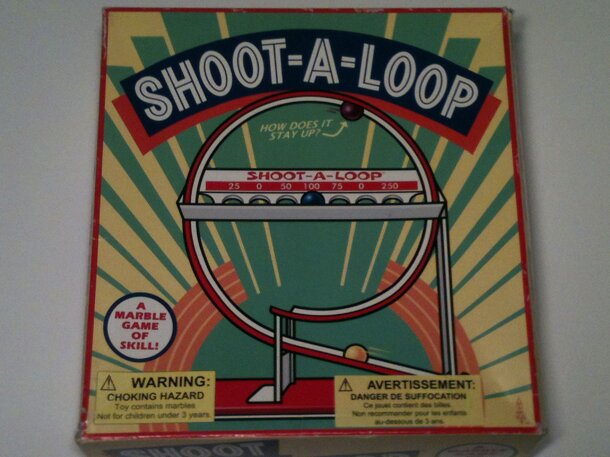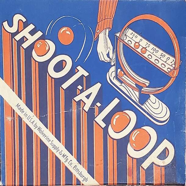 Shoot-A-Loop is a tin loop with a spring that launches marbles to the top where they will drop down into scoring holes. There are seven scoring holes with values of 25, 0, 50, 100, 75, 0 and 250 points. Included are three marbles in different colors. The instruction sheet includes five games: Triple Play - Each player shoots all three marbles, one at a...