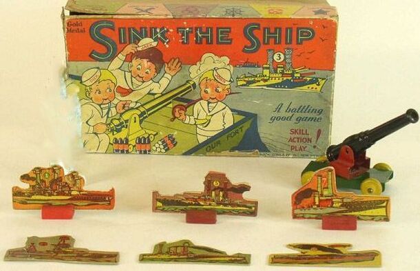 Shooting game. 6 targets, made of card. The targets are 'stood up' in wooden supports. A nice cannon is used to shoot at the targets. A player must knock over a ship to count as a 'success' and earn a point. You can decide before you start the winning conditions, first to score 5 successes wins, that sort of thing. Box - "A battling good game". I'm...