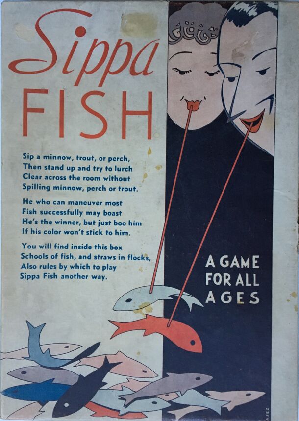 This 1936 party game consists of four sparkly blue straws and a box full of tissue-paper fish in two shapes (fish and sharks) and six colors (red, orange, yellow, green, blue and violet). There are rules for three versions on the inside of the game box. In the Shark! Shark! game, a mix of 20 fish and two sharks go in a bowl, and everyone tries to use the...