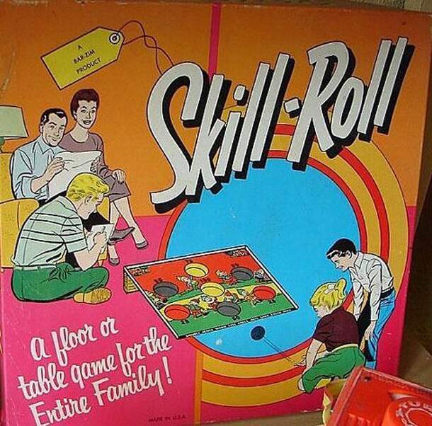 This is a table top version of the old fashion "Coney Island" type arcade game SKIP BALL. The board itself is made of stained wood and the game uses ceramic marbles. One long side of the bottom of the box has a triangular wooden cross-piece instead of a cardboard side and on the other long side there are two pieces of wood with grooves to hold a piece of...