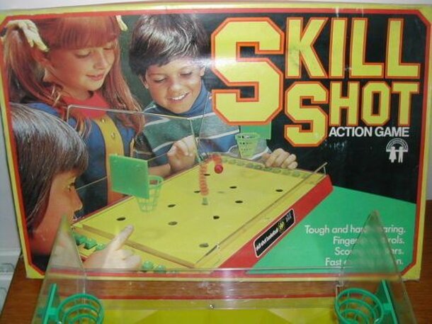 Action game for two players, related to Basketball or Netball. Each play at opposite ends of the board. In front of you there is a row of buttons. The board has a number of indentations, into which the ball will settle. When it does, if you press the right button, it will be ejected upward and forward. Of course, your opponent is trying to do the same...