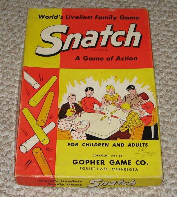 Listed on the box as “World’s Liveliest Family Game” & “A Game of Action” Snatch is almost identical to the traditional card game Spoons. It uses a deck of 40 cards with 4 each of 1 through 10 and a set of wooden dowels to replace the spoons. There are two notable differences between it and Spoons. In scoring the player caught out gets a letter marked...