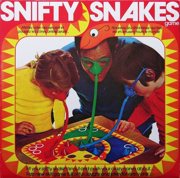 From those wacky Canadians comes this dexterity game in which you wear a nose/glasses apparatus with a long, flexible snake attached to the nose. You use your snake to push cones about the board (no hands!), trying to get them into various holes on the board to win points. From the box cover: Fit your snifty snake n' snout and push your crazy cones about....