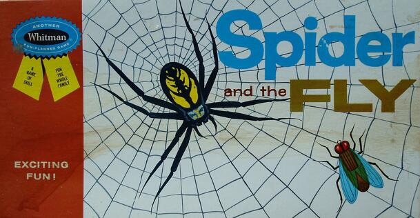 Spider and the Fly Whitman Publishing # 4720 "Another Whitman Fun-Planned Game" Player 1 plays a spider with a trapping cup. Player 2 plays two flies. The Spider shakes the dice in the spider cup, turns cup upside down in the center of the web, and lifts the cup. If both dice are even numbers, he tries to trap the Fly on the right with the cup before the...