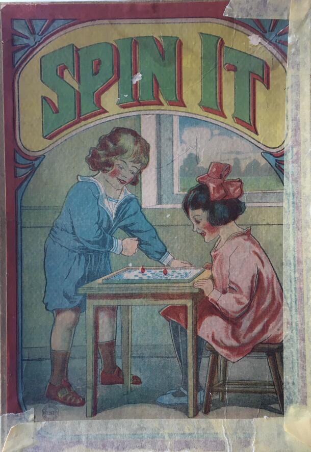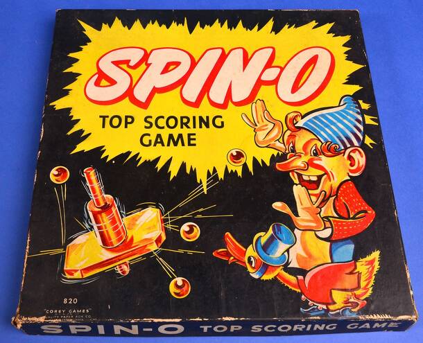 This two-player game from Milton Bradley comes with two acorn-shaped wooden tops and a target sheet of cardboard inset in the box bottom. The sheet has 18 holes with values ranging from 5 to 100. Players take turns spinning their tops and recording the value each time it stops. First player to 500 points wins. The earliest version of this game has a box...
