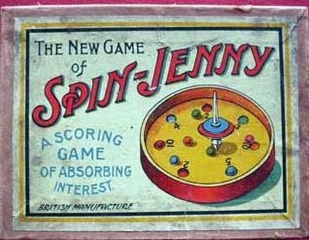 On their turn, Spin-Jenny has players spin a top in the center of a round, concave board containing nine holes, each assigned a different colour and value from 0-8. There are nine coloured wooden balls, free to move on the board, which are scattered by the top when it is spun. Points are scored according to the number assigned to a hole in which a ball has...