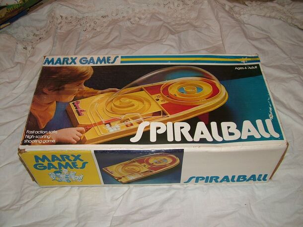 From the box: "Spiralball has a unique shooting action. The marbles are fired from the spring-action mechanism and enter the spiral channel which then launches the marbles swiftly in an arc toward the scoring holes. Of course, the plastic dome does contain the high flying careening sphere. You gotta know just how fast or slow to shoot those balls so you...