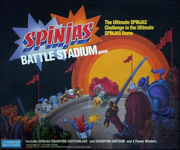 Spinjas is a ratcheted spinning top game created by Parker Brothers in the late 1980s. The game set was sold as a Battle Stadium plastic arena with two Power Winder launchers and two Spinja characters enclosed within the clam-shell designed arena. More characters, launchers, and an oversized playing arena were also made available separately. The objective...