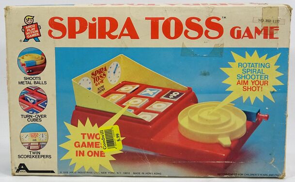Spira Toss is a unique table-top game that uses a metal ball which you shoot through a spiral loop. The spiral loop can be adjusted to reposition the direction of the ball. The landing point consists of 3-sided squares with either X - O or a number denomination. This allows 2 game versions and either 1 or 2 players. Game one can be played with one or two...