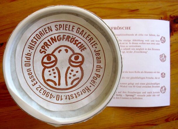 Every player has four round discs with frog pictures on them: a small, 2 medium, and a big disc. Every player tries to catapult the frogs in the packaging tube ("well") or a surrounding area marked with a paper ring ("Neigborhood") - frogs in the well count with point value. Everyone uses his catapult at the same time, one may collect frogs outside the...