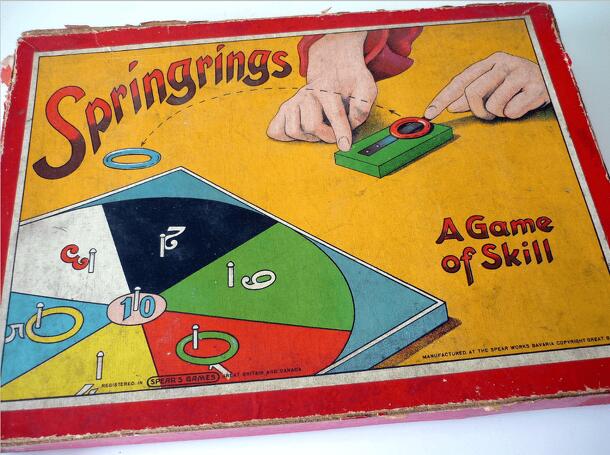 From the box: All You have to do is to put a ring on that funny little tin ring fixed to the ring and the press down the spring with Your finger and let it go suddenly. Up goes the ring and it falls on that pretty board with different colored divisions. If the ring falls into one of the 6 divisions it scores the number marked thereon. If You are lucky Your...