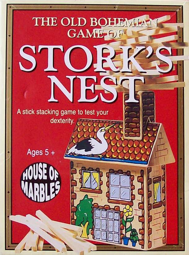 This game claims to be a 19th century Bohemian game replicating the problem people have with storks constructing their huge nests on top of chimneys. The game consists of a 3-piece wooden house (house, roof, and chimney), and 60 sticks. The sticks are divided evenly between the players, who take turns placing them in a stack on the chimney. If a player...