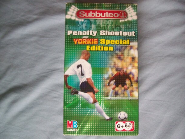 Subbuteo Penalty Shootout is a football (soccer game). It focuses on penalty taking. The attacking player flicks his Player to shoot the ball into the goal. The defending player operates the goalkeeper on a stick to defend the penalty kick. After taking 5 penalties each, the player with the most goals is the winner. A self contained game, it is designed to...