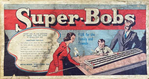 Super Bobs is an Australian skill game from the 1940s. An inclined rectangular playing board has 3 channels that players propel 3 glass balls along using a wooden cue. As the balls travel along the incline they stop on a score. If balls align across the board the players score is doubled. The highest score is the winner or the game can be played up to 500....