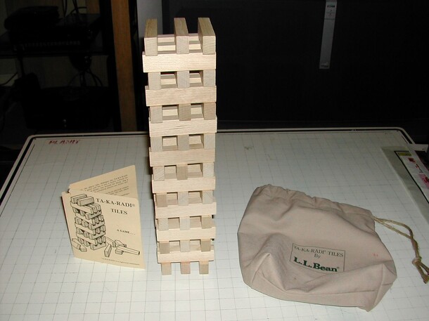 A balancing tower building game. Apparently based on an African game. It is very similar to Jenga, but predates it. You build a tower out of the narrow edges of 50 wooden blocks. Each level has three blocks, and the next level is built at right angles to the previous level. Each player takes a block from below the top and transfers it to the top level....