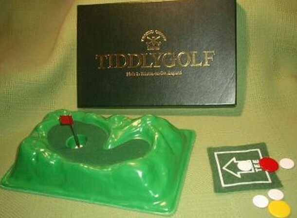 Simple Tiddlywinks variant in a small (15cm) square box with a fold-up hard board (4 x the size of the box) featuring 16 holes. The box says it's based on an original table-top board game from the 1920s. Landing in a lake or bunker sends you back to the start. Landing on another player's token sends them back 3 spaces. From back of packaging: Golf...