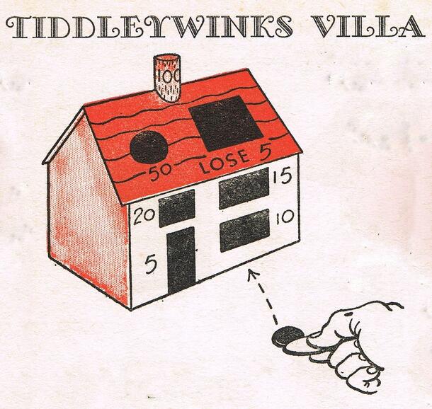 Game published in The Novelty Box, circa 1935. Children's game that you had to make before you could play. Detailed instructions tell you how you make the Villa from an old shoe box. The difference with this Tiddleywinks game is that there are six different scoring 'holes' in the villa. Positive scores are 5, 10, 15, 20, 50 and there is one negative score...