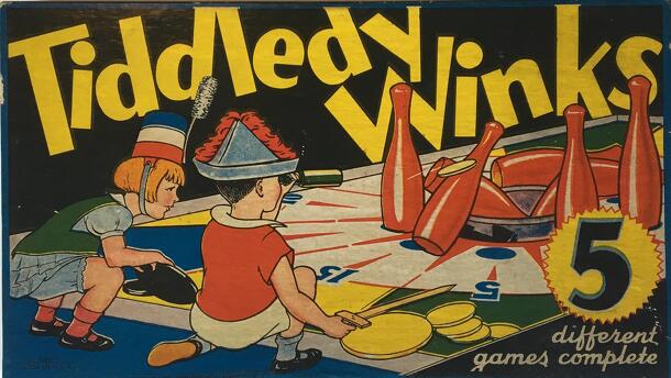 Tiddledy Winks varies based on publisher, but they all generally have a cup or other container that sits in the center of a target. The object of the game is to flip small smooth disks (the "winks") into the cup. This is accomplished by placing a wink on a piece of felt and then pressing down on the edge of the wink with a larger disk (the "tiddledy") so...