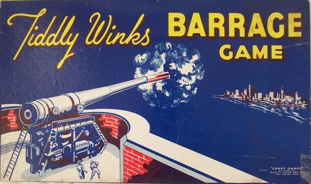 From the rules: Players form two teams. Each team has five tiddly winks and one larger wink for shooting. Players place the winks, one at a time on the Battery Emplacement. Each team now shoots his winks as fast as possible (without waiting for turns), in an endeavor to land the winks in the opponent's seaport, munitions dump, air field, and munitions dump...