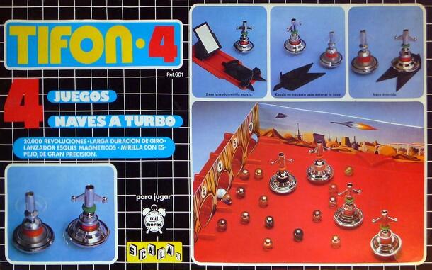 4 spinning tops for 4 different games, that's essentially Tifon (Typhoon) 4. Although other elements like marbles or a shooting platform are included, the metal spinnings tops, identified as "spaceships" in the gamer's manual, are the main element in the different games described: -Cosmic Soccer: The marbles are placed in the center of the field and, then...