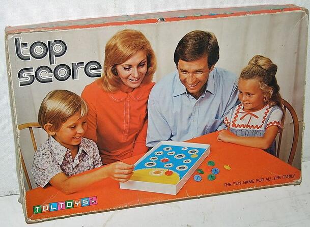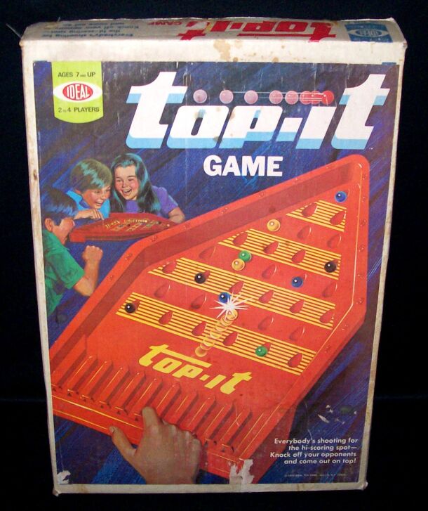 From the box: "Everybody's shooting for the high scoring spot - Knock off your opponents and come out on top!" Box measures approximately 14" x 19" x 2 1/4". Marbles are flicked into shallow, point scoring depressions on a gently inclining plastic board. The top half of the playing surface is triangular, so as scoring depressions increase in value they...