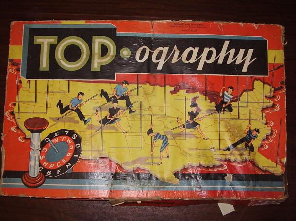 This game teaches American geography - in particular city names and locations. Players take turns selecting either red or black and then spinning the Alphabet Top. The player then announces either the red or black letter as appropriate. Next, that player inverts the sand timer and places pegs next to cities on the map of the United States that start with...