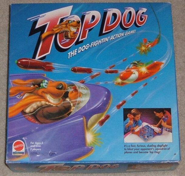 Two player dexterity game of launching balls into a playing area where planes 'catch' the balls and fall to the ground. The box is part of the game itself and the action is fast and fun. From the box... "The Dog-Fightin' Action Game!" Ready, Aim, Fire Away! You've got to get your opponent's planes before he gets yours. Load your ammo, line up your planes...