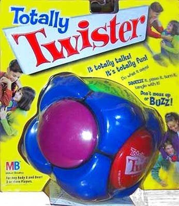 Totally Twister is an electronic contraption that looks something like a multi-colored cube. There are a few different types of games available for it, such as "Pass It" and "Turbo Pass" but the object generally involves quickly passing or moving the contraption between two people by placing it between the two named body parts. It's more akin to Funny...