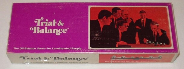 "The Off-Balance Game For Levelheaded People" This is a vintage dexterity game from 1969. Based on the business executives shown on the cover illustration Trial & Balance was the kind of decorative item a corporate ladder-climber would keep on his desk. The challenge is based on a fulcrum and balance beam with six slots spaced at regular intervals. There...