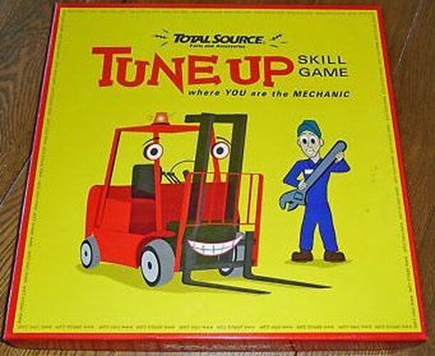 Tune Up, "where you are the mechanic," published by Total Source Parts and Accessories, For ages 6 and up, 1 or more "mechanics." It plays like the classic game OPERATION, but instead of a human patient, you're working on a cartoonish forklift, dealing with items like an empty tank, sparkless plug, squeaky wheel, sore bottom, kinked hose, etc., that need...