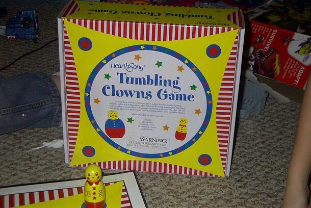 From the box: "This easy game for two to four players is a great way to introduce young children to the fun of basic gameplay. Players take turns spinning the big clown and knocking over members of his troupe of tumbling clowns. The object of this fast-paced game is to knock down more tumbling clowns than the other players. Recommended for ages 4 and up."...