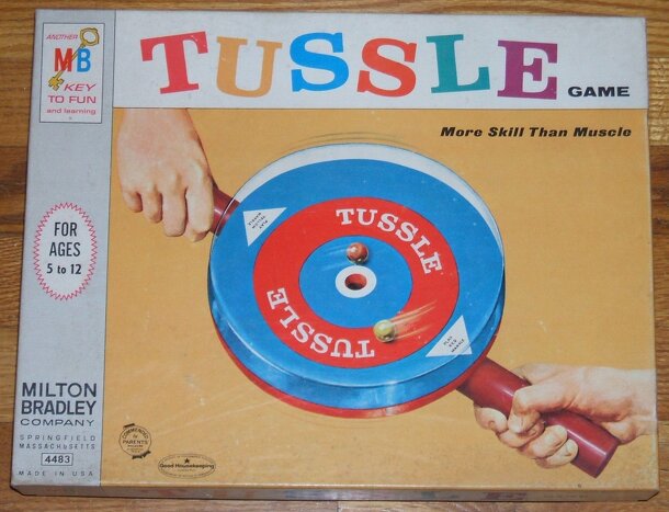 A skill contest for two players. Tussle has two enclosed marbles which roll over a target platform containing one hole in the center. Each player grips a handle and both at the same time try to roll their color marble into the target hole. The slightest movement will send the marbles rolling but since both players are moving their handles at the same time...