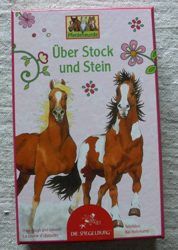 From the box: "Not only speed counts at the steeple-chase, it mainly demands skills. Only the one who jumps over the fences safely and manages to sidestep the other obstacles is the winner. A game of skills for 2-4 players where the horse tokens have to be flipped through the show jumping course." A steeple-chase course is created using the 2 pieces of...