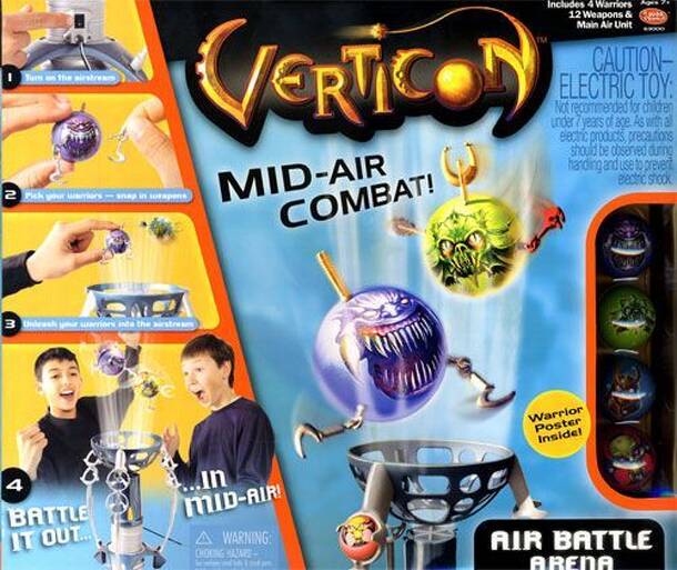 Mid-Air Combat (from the back of the box) Discover a sport unlike any other as you enter weightless mid-air combat. Choose your warrior, position your weapons, then go to battle ! Prove your superiority and overthrow your opponents one..by..one. A game where one outfits a ping-pong like ball with 2 to 5 scale, plastic weapons. Place your ball in a stream...