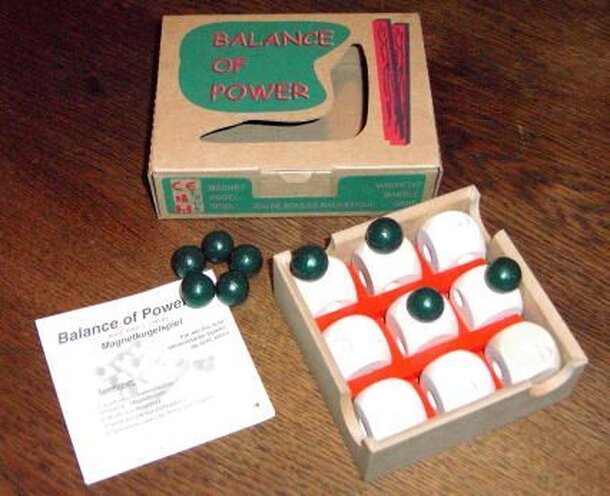 You have to place the magnetic balls in the pits on top of the nine dice. There are two variations of the game. One is to place the balls tighter than your opponent. It's mostly a solitary competition. The second one is more strategic. You roll all nine dice and have to announce how much of the pits you can fill. Than the next player places the dice in the...
