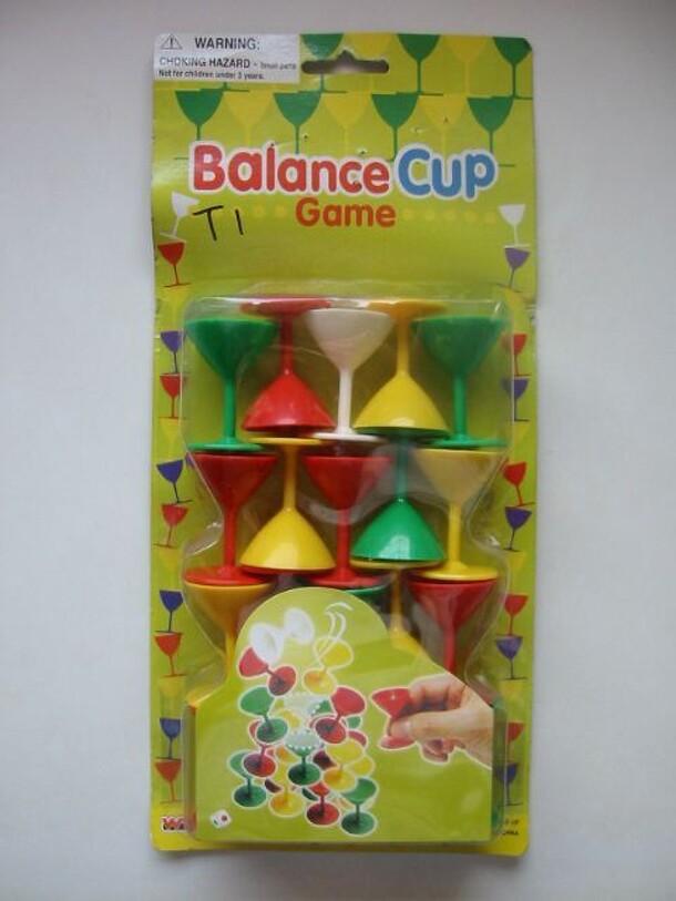 The Balance Cup Game (Wing Tat Hang Kee Co. Ltd.) is a simple dexterity game using plastic cups shaped like martini glasses. 20 plastic cups in four colors (including one white cup) are arranged in a pyramid with the white cup at the top. Players roll a special six-sided die that has three sides showing a black cup, and the other three sides showing a dot...