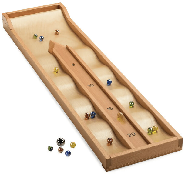 With a strong, but if possible not too energetic snap, the players set their colored marbles on their way. The middle lane serves as a launch ramp, on which the balls accelerate to roll over as many waves as possible after a turn. The up to four players take turns with one of their marbles each. Three scenarios are possible after the start: The ball can 1....