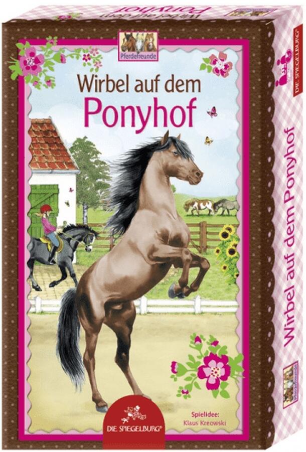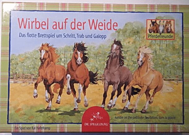 Horse-themed dexterity/action game for children. Components: one metal tin, one cardboard chit, 40 cards The first player to collect 6 cards wins the game. The cards are shuffled and placed face down on the table. The active player puts the metal tin on or next to the cards, compresses its lid and places the chit on the lid. Then the lid is compressed at...