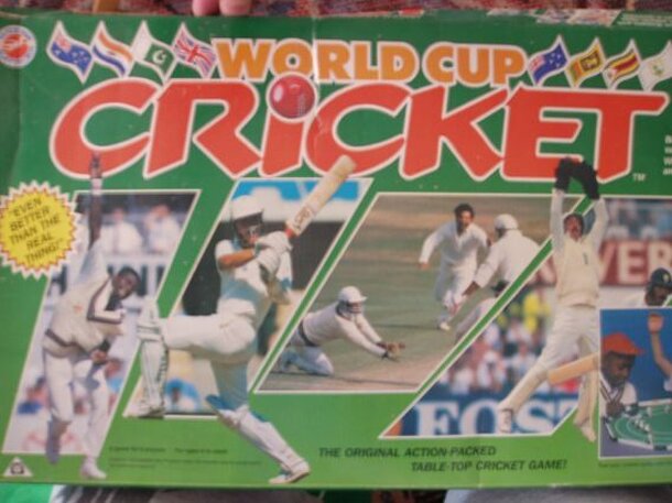 World Cup Cricket is touted as "The original action-packed table-top cricket game!" for Ages 4 and up. In the box (decorated with action shots of late 80s / early 90s players including Alec Stewart and Jack Russell) comes with a green beize (?? beige) playing area which is laid out on a table, with six boundary fence sections which Velcro around the edge...