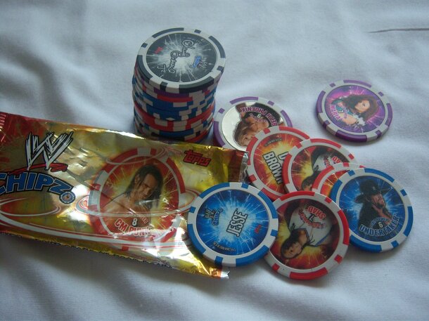 A collectible poker chip game from Topps. Each pack comes with four random chips. Each chip has a picture of a WWE superstar on one side with a chip value and the name of the superstar on the other. There are rules for six different games included with each pack. The games are all simple dexterity games such as spinning the chips on their sides, tossing...