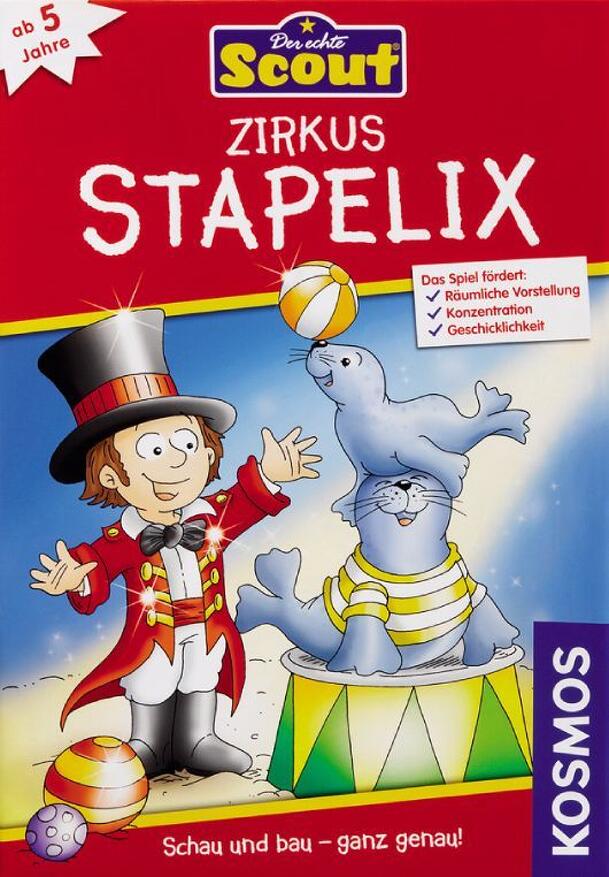 Zirkus Stapelix takes place in a circus setting. The active player flips open the top card from one of the three stacks (showing 1, 2, or 3 balls depending on the degree of difficuly of the card) in the middle of the table and memorises the arrangement of the playing pieces (animals, director, balls etc.) After turning the card face down, the player tries...