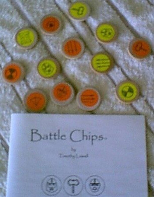 A unique game, Battle Chips contains 30 wooden chips divided into two armies (orcs versus barbarians). Each army has (in descending order of strength) one leader, one wizard, three bowmen, four pikemen, and four warriors. They also have two shield-bearers. On the back of each chit is simply an orc face or a human face, which, if used in combat, is lower...