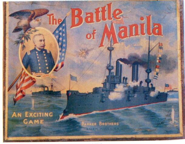 A very early Parker Brothers game (often mentioned in histories of the company), Battle of Manila is a Spanish American War boardgame with chromolithographed box lid and board with Manila Bay, 15.5" x 19.5" x 2" high. Unlike today's heavily detailed "conflict simulations", this game apparently mainly involved hitting soldier targets on a board with hand...