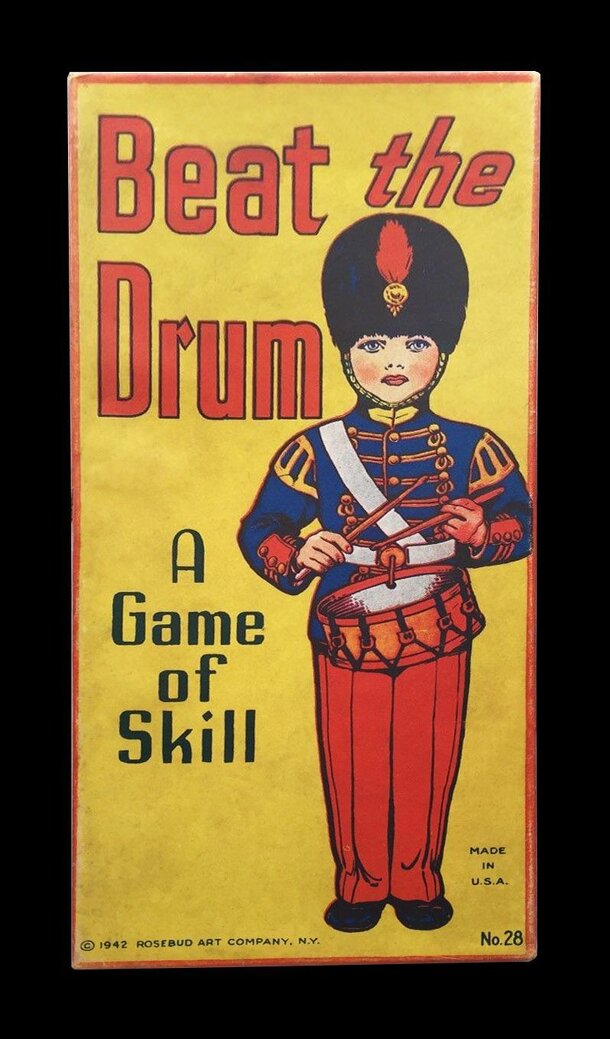 This is another shooting game from Rosebud Art Company. The purpose of the game is to launch wooden discs by flicking them off a launching block with your flinger, then ricocheting the discs off the drummer backstop and onto the drum or the scoring grid below. 100 points a rewarded for landing on the drum. Points on the are as follows: 10, 50 (under the...