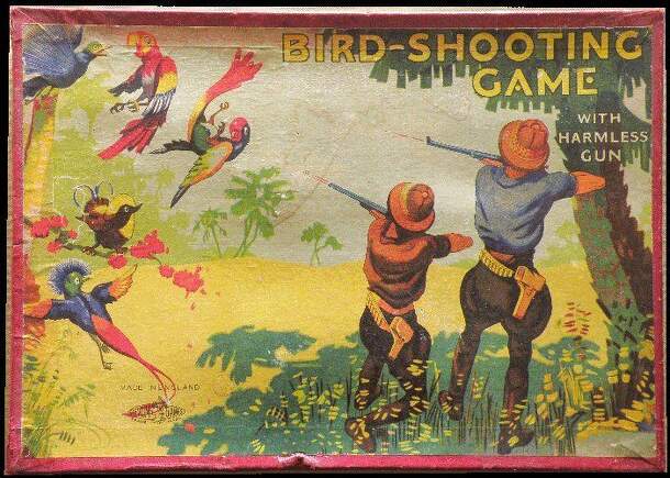 Bird-shooting indoor target game with the subtitle "...with Harmless Gun." The contents include nicely drawn, colored and printed cardboard cut-outs of four exotic birds which, with the aid of the attached wooden supports to the rear of each, enable the bird to swivel back when struck by a cork as fired by the toy shot gun. A tabletop action dexterity...