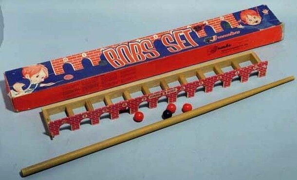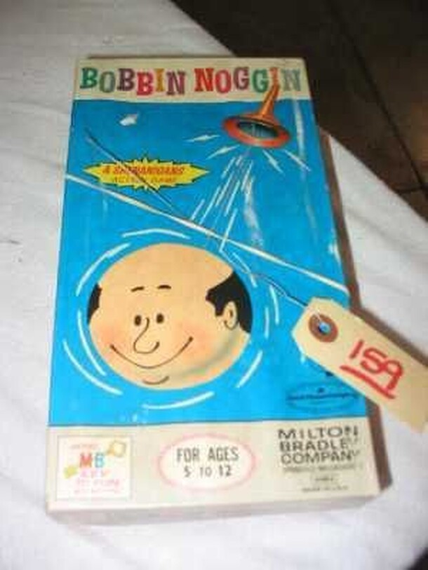 Featured on the television show "Shenanigans" prior to release. ("Shenanigans" was sponsored by Milton Bradley.) Listed in American Games, #4519. 1964, Skill, Action game. A test of skill and coordination. Bobbin Noggin is a head and hat connected by a length of elastic. The player grips the top of the hat which has a light magnetic attraction for the...