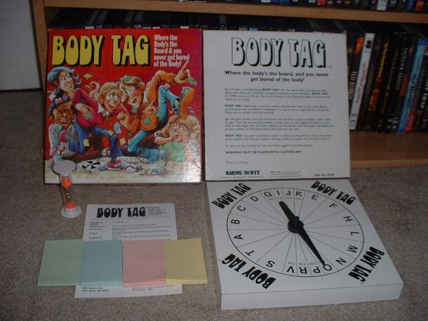Body Tag takes only a minute to master and promises hours of fun. Each playing surface poses new and different challenges. It's easy to rub an opponent the wrong way. Moves can be ticklish, hairy, and exciting. Spin the giant spinner, turn the sand timer over, and then as fast as possible, stick a sheet of paper from the special pad provided, on every part...